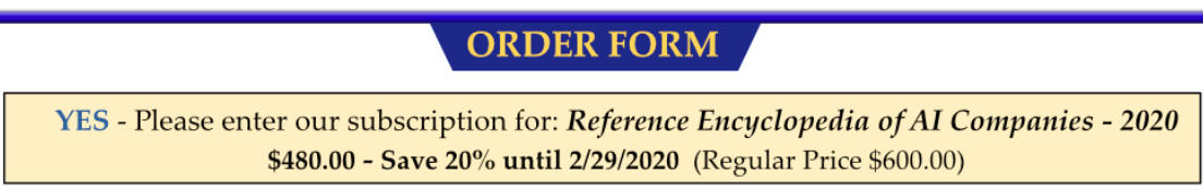 YES - Please enter our subscription for: Reference Encyclopedia of AI Companies - 2020